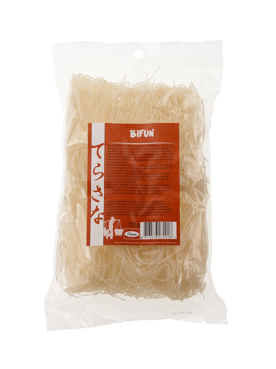 | Gebruikstips | Nog, nooit, gehoord, van, bifun?, Het, is, een, soort, spaghetti, gemaakt, van, rijstzetmeel., Volledig, zoutloos, en, vrij, van, tarwe., Erg, lekker, als, knappertje, in, soepen, of, salades., Maar, kook, het, niet, te, lang, want, na, twee, minuten, koken, wordt, de, bifun, wat, plakkerig. |